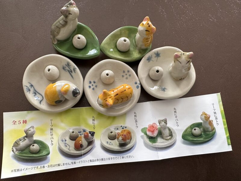 こちら、シャイングさんの「ねこがいるお香皿」で全5種類です。かわいい猫が乗っている香皿です。