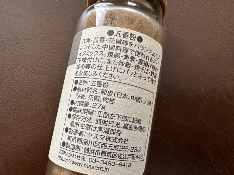 うちにある五香粉は成城石井で買ったMASCOT ORIGINALの五香粉です。五香粉なんてそのへんのスーパーに売ってないかも知れないと思い、いきなり成城石井に買いに行ったので、近所のスーパーでも手に入るのかわかりません。カルディーにはあると思います。