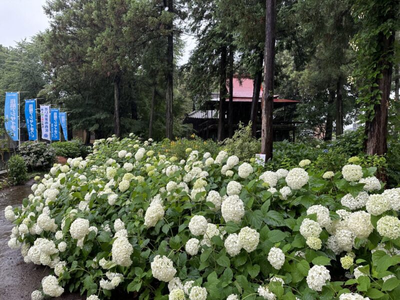 神社周辺の森には、20種380種類以上の紫陽花が植えられていて、5月から8月にかけての長い期間、開花リレーを楽しむことができるそうです。