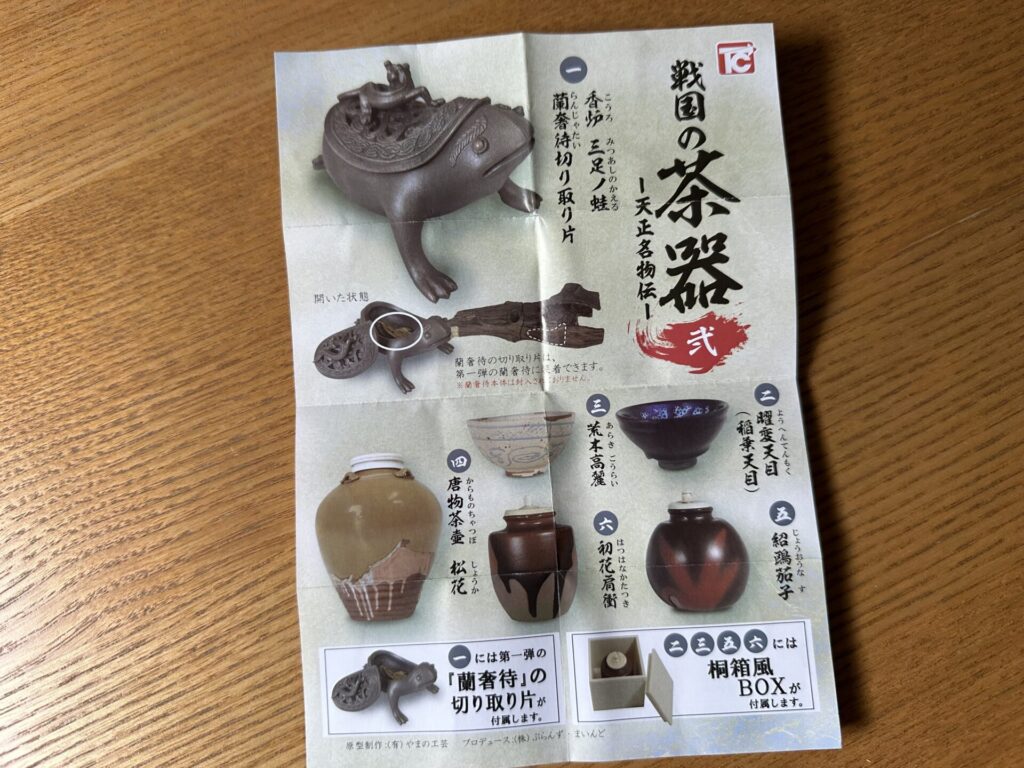 こちらは(株)トイズキャビンのガチャで「戦国の茶器 弐 ー天正名物伝」の「香炉 三足ノ蛙 蘭奢待切り取り片」という商品です。