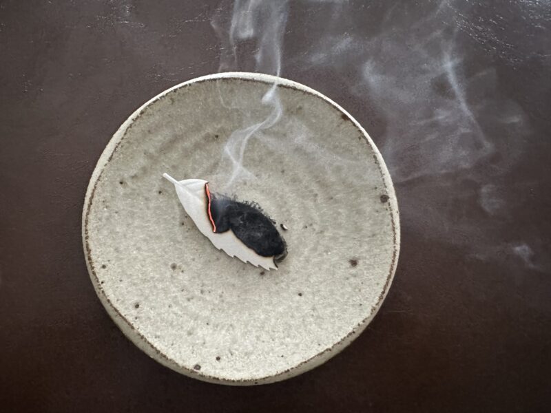 そして葉っぱに火をつけて炎を吹き消して煙をくゆらせます。