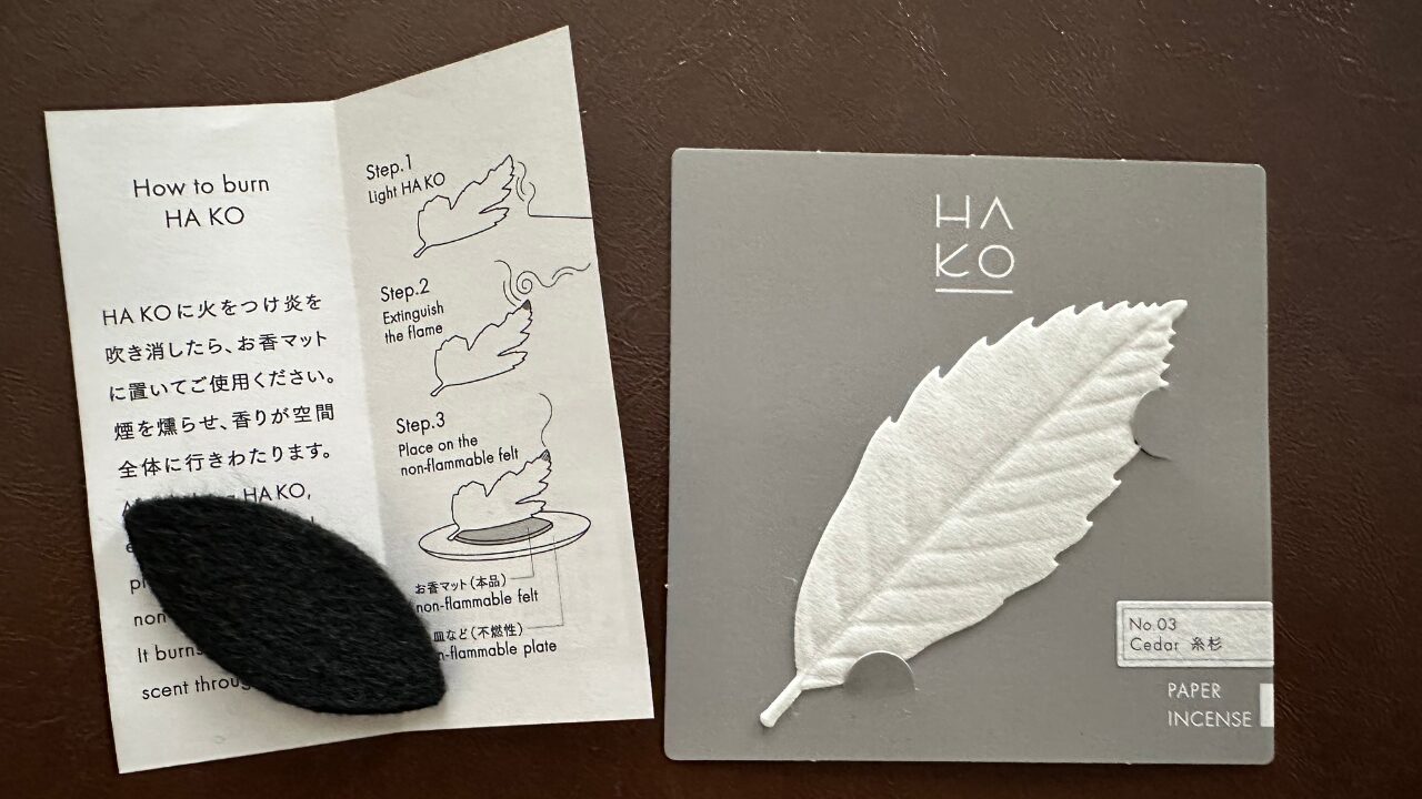「葉っぱのお香『HAKO』(ハコ)」という名前の紙タイプのお香です。