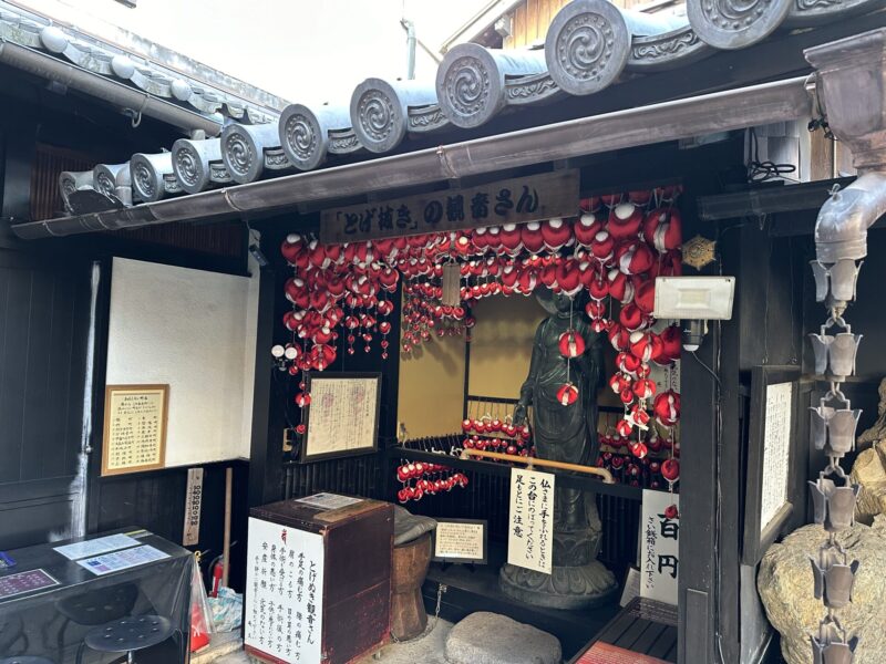 町中を散策していると、家の軒先にたくさんの赤い身代わり申が吊るされています。