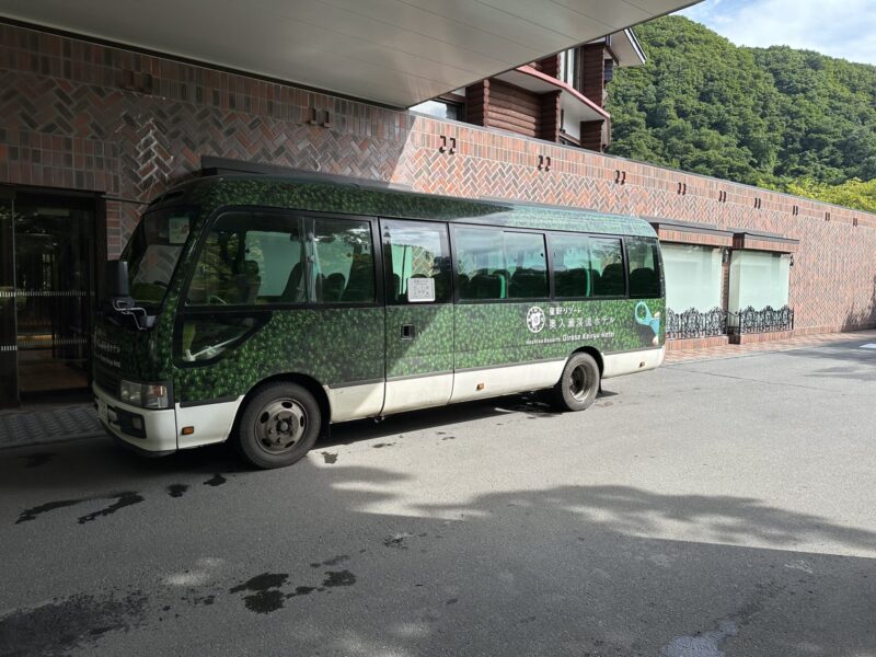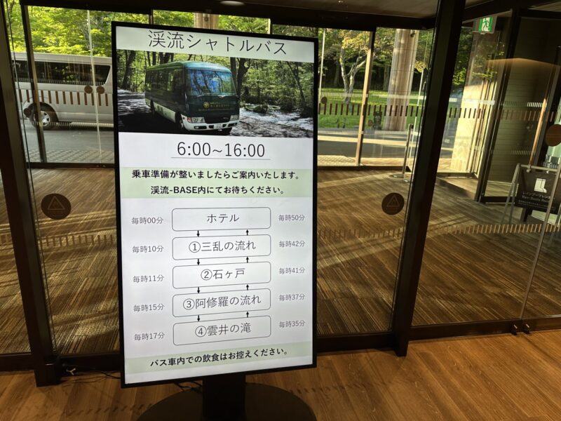 シャトルバスで早朝の渓流散策へ