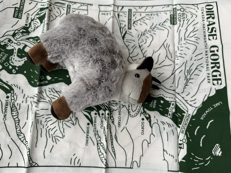 カモシカのぬいぐるみと奥入瀬渓流の手ぬぐいです。
