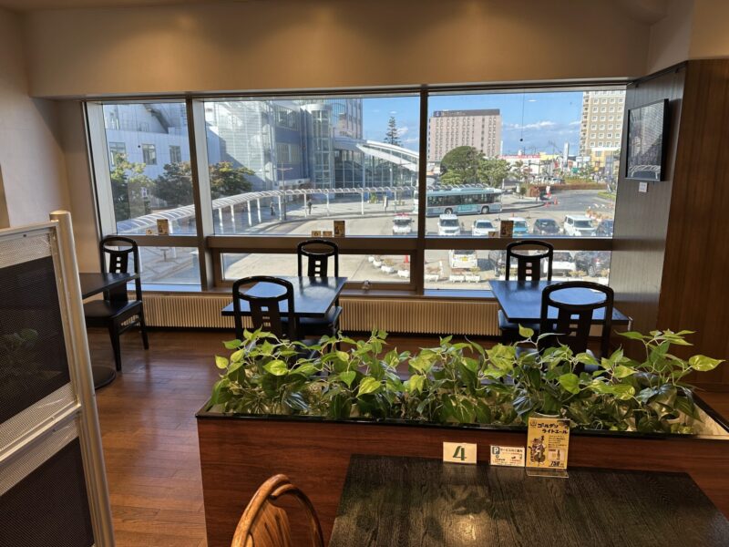バスのロータリーが見下ろせて眺めがよいレストランです。