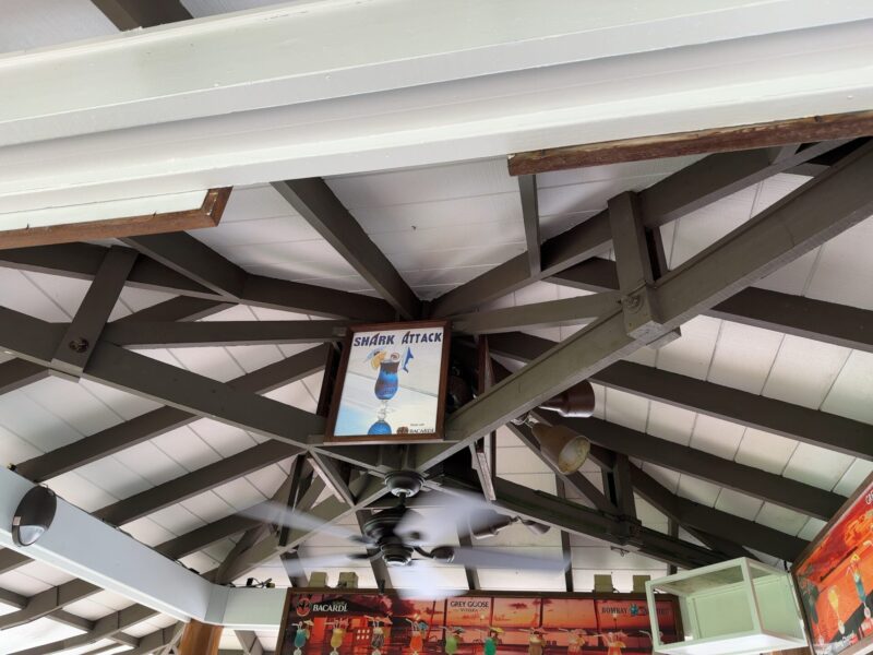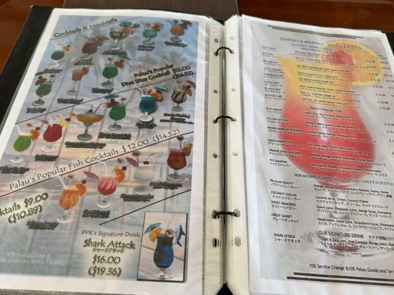 ダイビングスポットの名前を冠した「ブルーコーナー」と「シャークアタック」というサメの木彫りのスーベニアがついた名物オリジナルカクテルを注文。